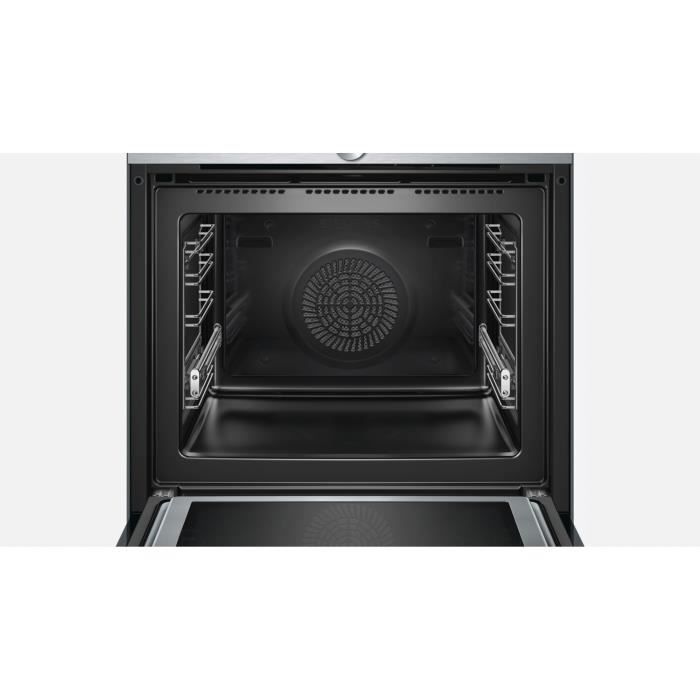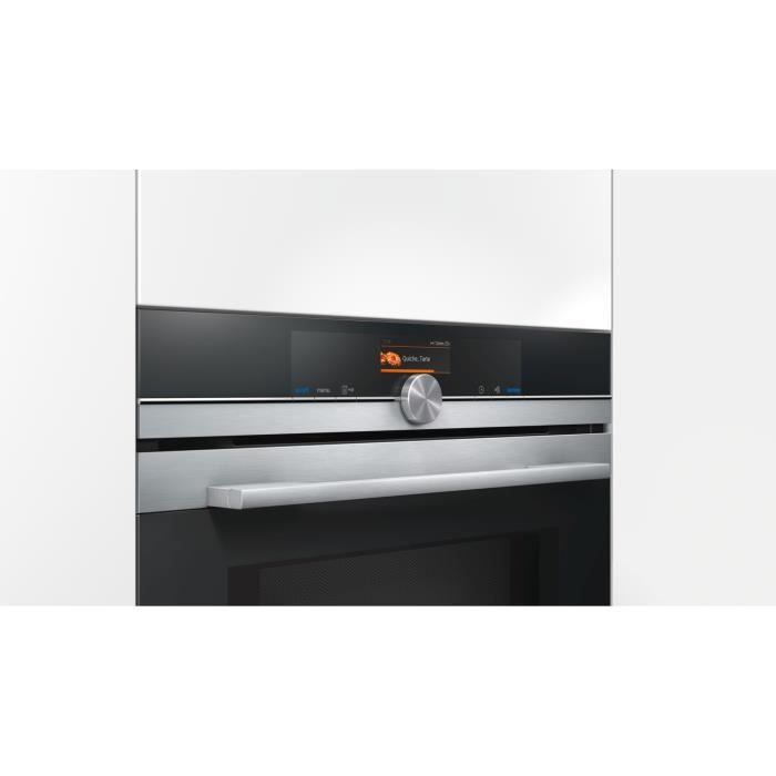 SIEMENS – Four micro-ondes combiné pyrolyse inox 67 l – Ecran TFT tactile couleur 3,7′ avec texte clair – Monobouton central – 13 modes de cuisson – Fonction varioSpeed – Home Connect – Porte abattante, Système softMove – Porte froide 4 vitres – Préconisation et affichage de la température – Rail télescopique 1 niveau