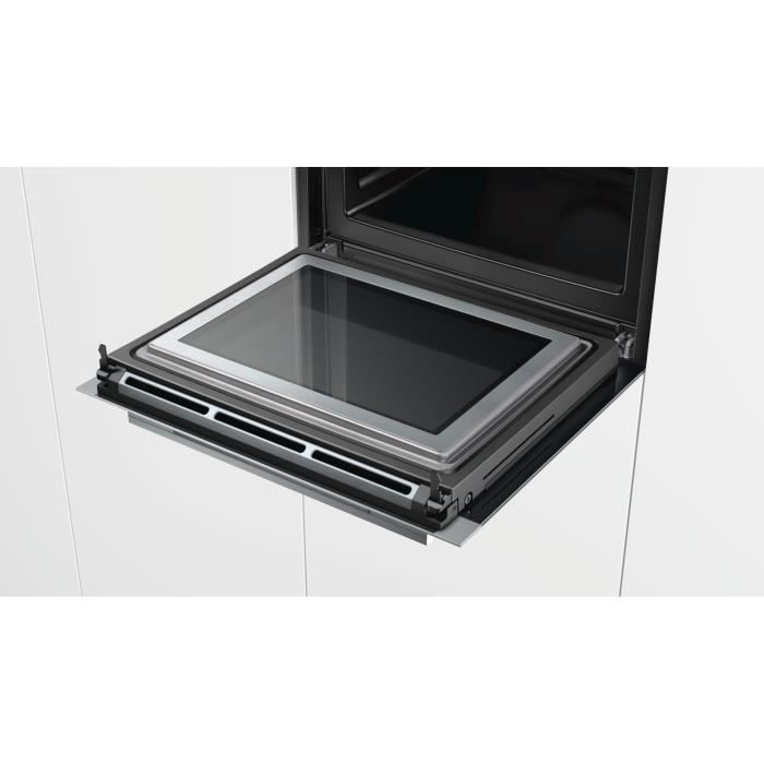 Nettoyage Pyrolyse Gradins et tôles à pâtisserie pyrolysables Ecran TFT tactile couleur 3,7 , avec texte clair Monobouton central Volume 67 l 13 modes de cuisson : Air pulsé 4D, convection naturelle, convection naturelle Eco, chaleur de voûte et de sole, gril grande surface, gril petite surface, gril air pulsé, maintien chaud, cuisson basse température, préchauffage, position pizza, hotAir Eco, coolStart (pour les surgelés) Puissance max. : 900 W – 5 puissances micro-ondes (90 W, 180 W, 360 W, 600 W, 900 W) avec Système Innowave avec la technologie Inverter Home Connect : pilotage et contrôle de votre four à distance Porte abattante, Système softMove : fermeture douce assistée, ouverture douce Porte froide 4 vitres Préconisation de température Affichage de la température Contrôle optique de la montée en température Fonction Sabbat Rail télescopique 1 niveau, pyrolysable (s) Préchauffage Booster Éclairage LED Verrou de porte électronique Sécurité enfants Coupure automatique du four Indicateur de chaleur résiduelle Touche marche Interrupteur au contact de la porte Ventilateur de refroidissement
