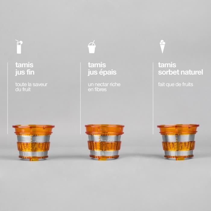 Technologie de pression douce assurant une qualité de jus avec un maximum d’avantages nutritionnels Vitesse de rotation optimale pour une meilleure conservation des nutriments 1 filtre externe pour filtrer la pulpe 3 tamis : jus fin, jus épais et sor
